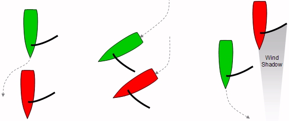 But cutting inside is difficult because you have to pass though the other boat’s wind shadow, as shown in the third diagram. Jibing to get a little extra speed only puts you on port tack with no rights.