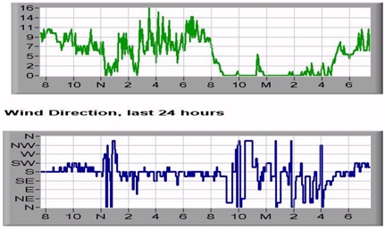 This makes a lot of sense because the stronger the breeze, the more the momentum, and the more the momentum, the less likely the direction is going to change. It’s like riding a bike – the faster you go, the harder it is to change direction. The opposite is also true – a light breeze is almost always shiftier, as shown by the wind speed and direction at the CSC weather station: