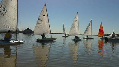 It's January. We had plenty of sun, warm temperatures, and a touch of a breeze. Doug and I sailed double handed on a Laser and trailed the fleet. For us, it was a very relaxing, enjoyable sail on a beautiful day. Just what the doctor ordered. Most of the fleet was doing the crouching tiger position practicing the fine art of keeping a boat moving in little to no air. Regardless of the uncomfortable position and the slow motion racing, the weather was just too good not to appreciate.