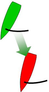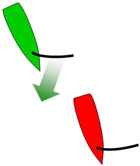 Green is me and the green arrow is the wind direction and my wind shadow. Normally, green catches and passes red and is in complete control, as we have seen in the previous articles: