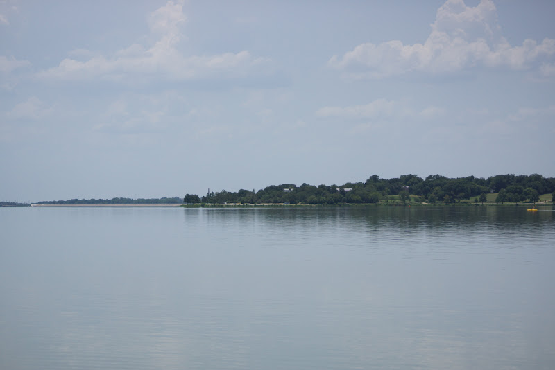 With temps rising and wind dwindling we decided to take the normal lunch break and see if conditions would improve for a third race. While cooling down at the WRBC clubhouse we watched the winds die to about 1-2 mph and the lake become on large sheet of glass. The third race was abandoned so we enjoyed a little more time chatting and telling stories in the shade. As Roland and I went to pick up the marks, the lake was as still as it could be. Several kayaks, canoes, and paddle boarders were taking advantage of the conditions.