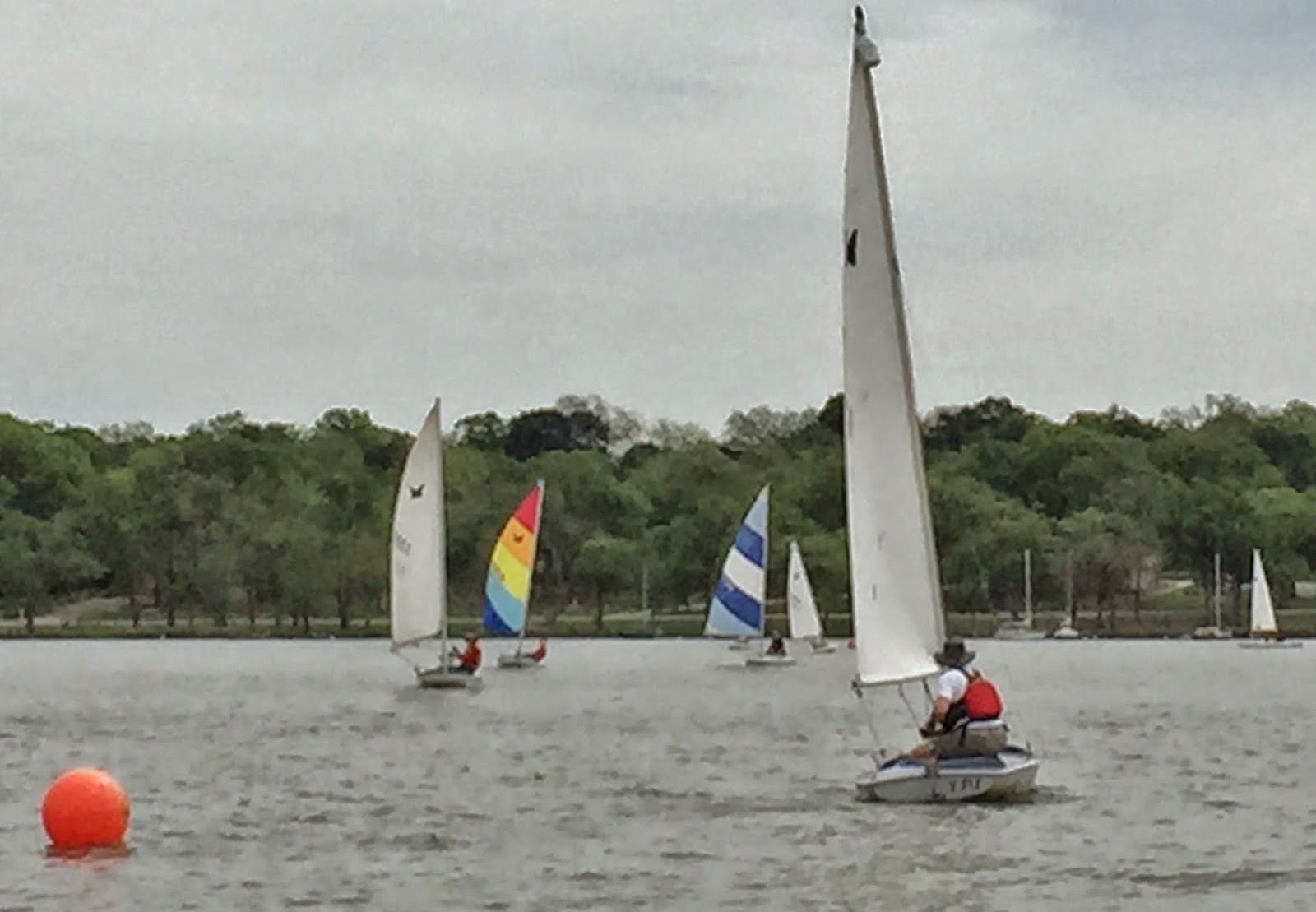 Seven boats on the line for the first two races, then five for the last race. For such a beautiful day, attendance was light. The winds were light and variable from the ESE, but we still managed to keep moving pretty well most of the time. It was a cloudy day and the temperature was perfect.