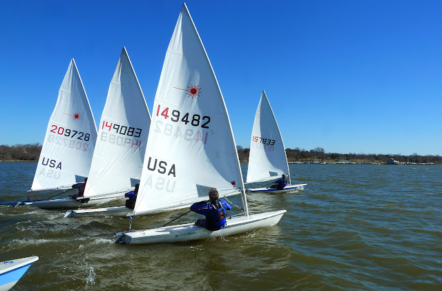 For the Lasers, 1st place was taken by 3 different sailors: Doug P. in the 1st race, Alex in the 2nd, and Forest in the last race. Lots of fun to see the Lasers out with us but it does make race committee more challenging.