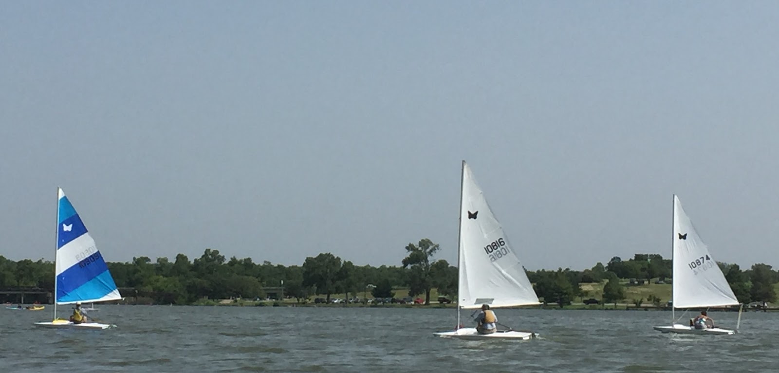 Meanwhile, Paul and Bowman were on race committee and went above and beyond! It seemed they were not still for a moment, either dragging logs out of the lake, taking photos and videos, rescuing capsized Butterflys or just hovering nearby while self-rescue was attempted. Four capsizes in all with only one being able to self-rescue. And all of this after Paul had driven back from Michigan where he was 1st in all 6 races, capturing 1st place in the Butterfly Open National Championship while also giving advice to younger sailors about mast rake in heavier air, etc. And not only that he brought back a new hull for Bruce in the back of his pick-up truck. We are so lucky to have Paul as our fleet captain. Yea, Paul! And yes, he admitted to being tired at the end of the day.