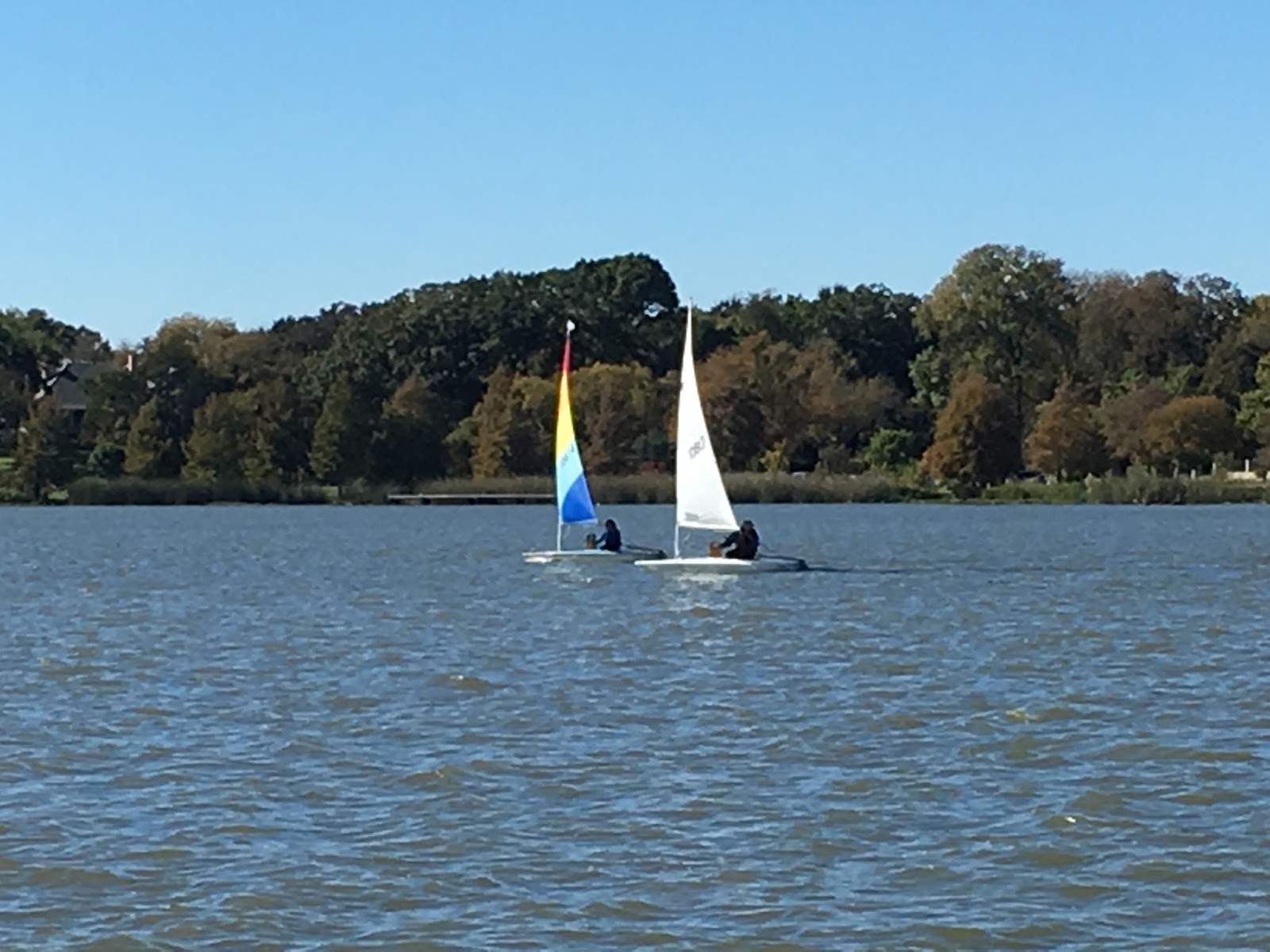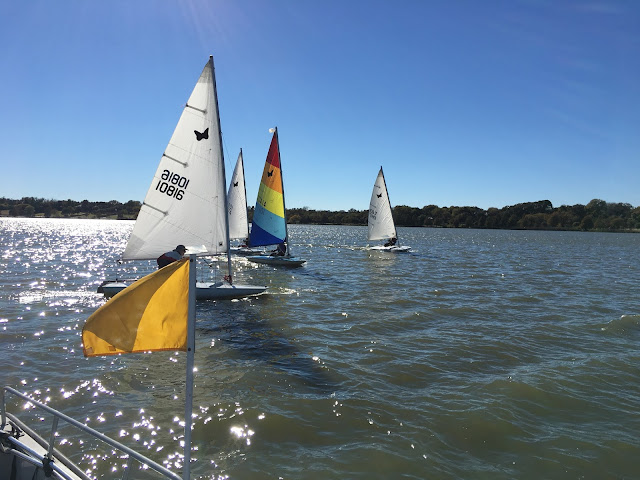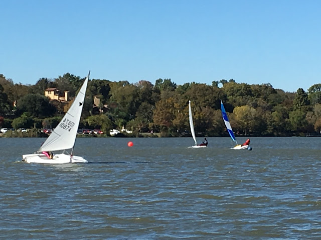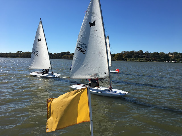 Great day on the lake today, brisk NW winds and cool temps. Winds averaged 11-15 mph, some gusts as high as 18. We had 7 Butterflys on the line, with Laurie running the show (with me) from the committee boat. Yes, her curse is finally broken, the fleet actually sailed 3 races while Laurie had duty! Anyway, the race finishes were as follows: