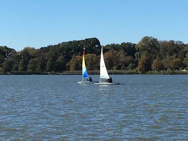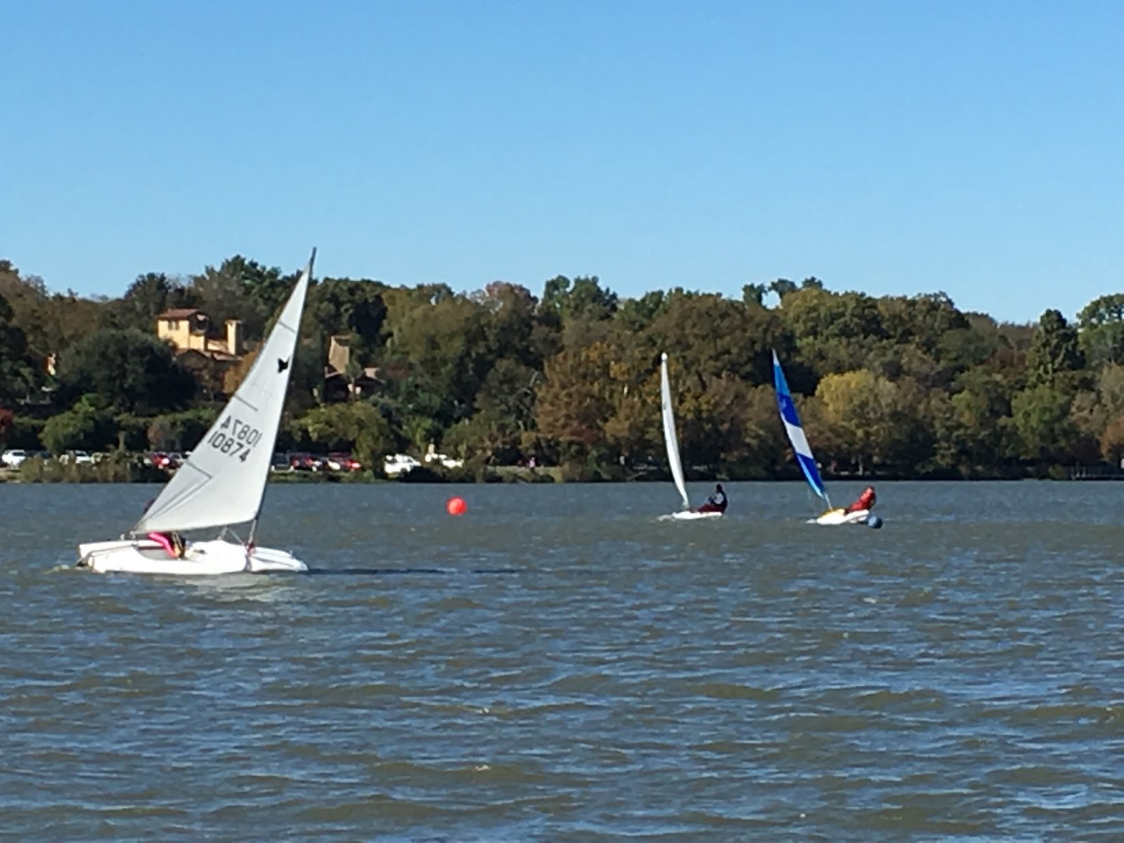 We had to review the photo finish, and it was Sandy, Bruce, Cathy (hidden behind Sandy's sail), and Nancy.