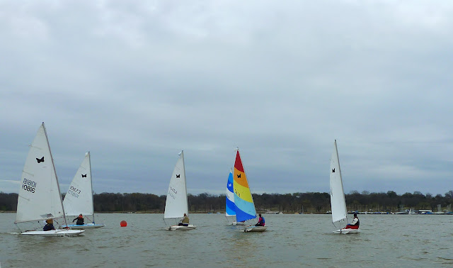 We've been pretty lucky for February. Paraphrasing Jim's comments from the last two weeks: Two weeks ago we had very pleasant weather but the wind died during the first race, it was shortened, and there were no more races for the day. Last Saturday's weather was delightful. Winds were variable in intensity and direction. But, winds were generally light or moderate. We had zero capsizes.
