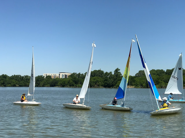 Springtime in Texas has brought us too much wind to sail so when we finally had a nice 5-10 mph SE wind, ten of us showed up to race. It was a beautiful day. Sam and Bruce were on race committee and due to shifting wind they reset the course a few times and we ran three races back to back as the wind began to dwindle. I have not seen the scores and was pretty far back - but rumor has it that Larry was on fire and was sailing quite well, with many commenting that they were going to start following him. Amber and Tom were out and then Tom went in and took Shannon out for a sailing lesson.